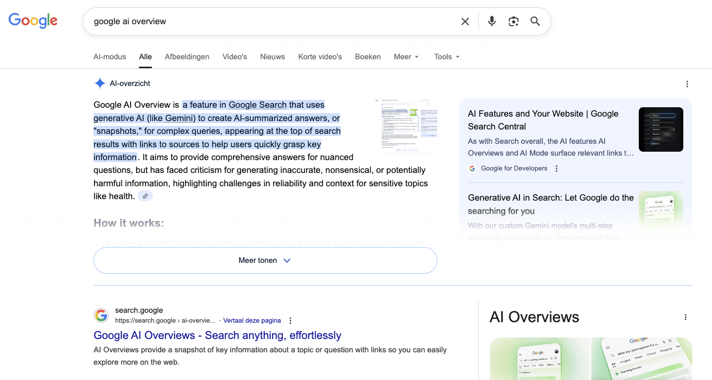 In de praktijk zie je AI Overviews vooral bij zoekwoorden met een informatieve zoekintentie (uitleg, how to, vergelijking, vraagvorm en long tail). Tegelijkertijd breidt Google dit zichtbaar uit richting commerciële en transactionele zoekopdrachten.